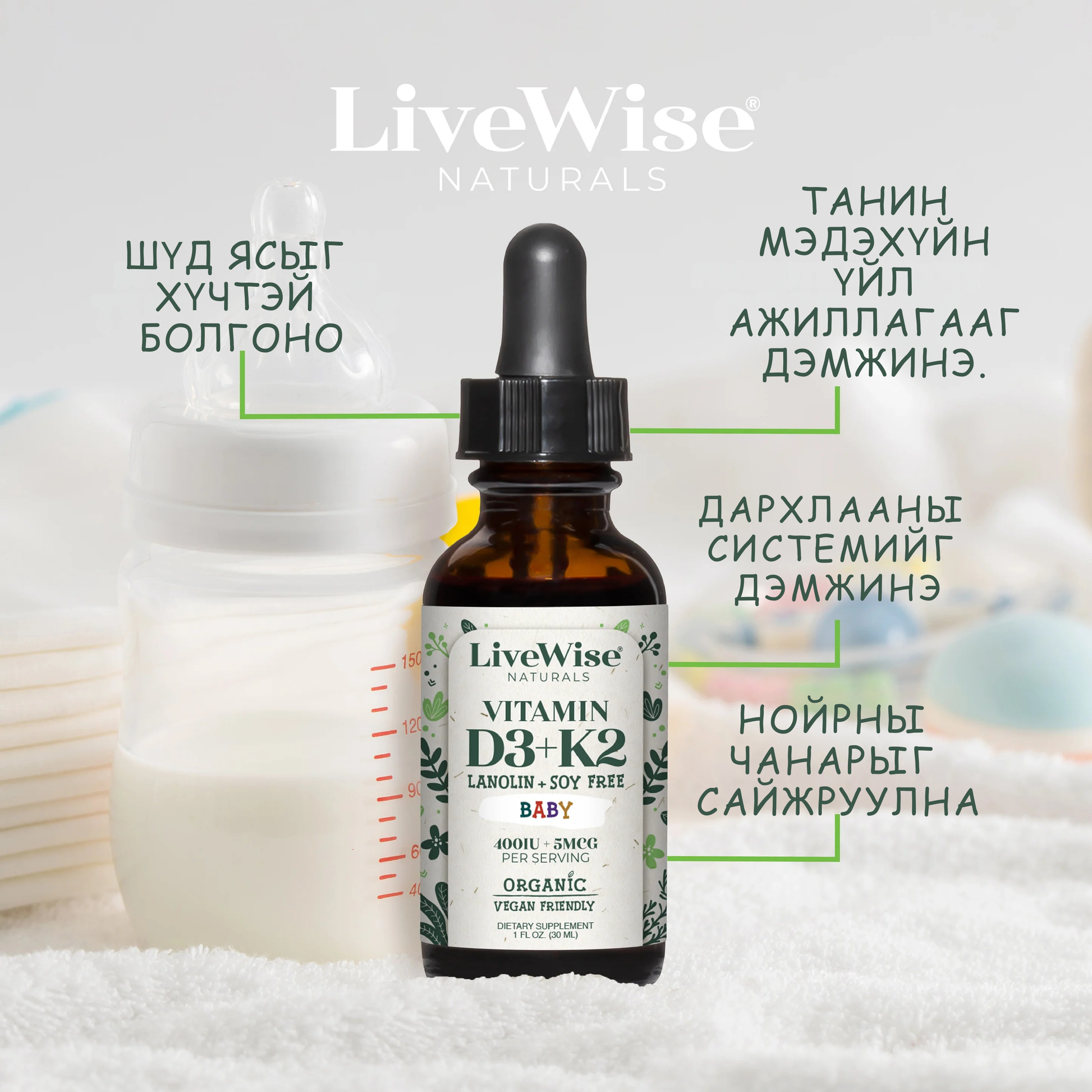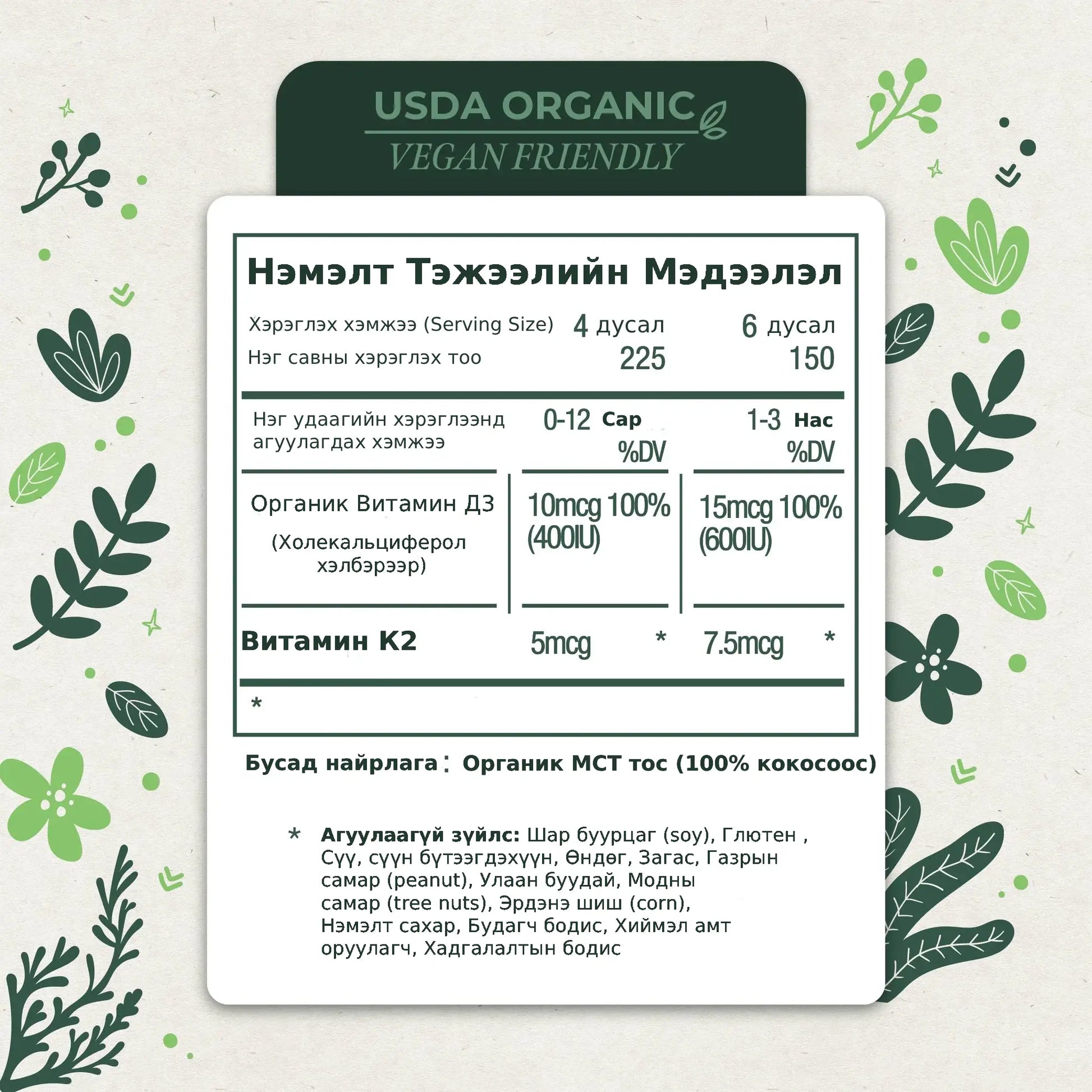 Энэ бүтээгдэхүүн нь 0-1 насны хүүхдүүдэд тохиромжтой, ургамлын гаралтай, нарсны ханднаас гаргаж авсан витамин D3-г шар буурцаг агуулаагүй K2-той хослуулсан.
