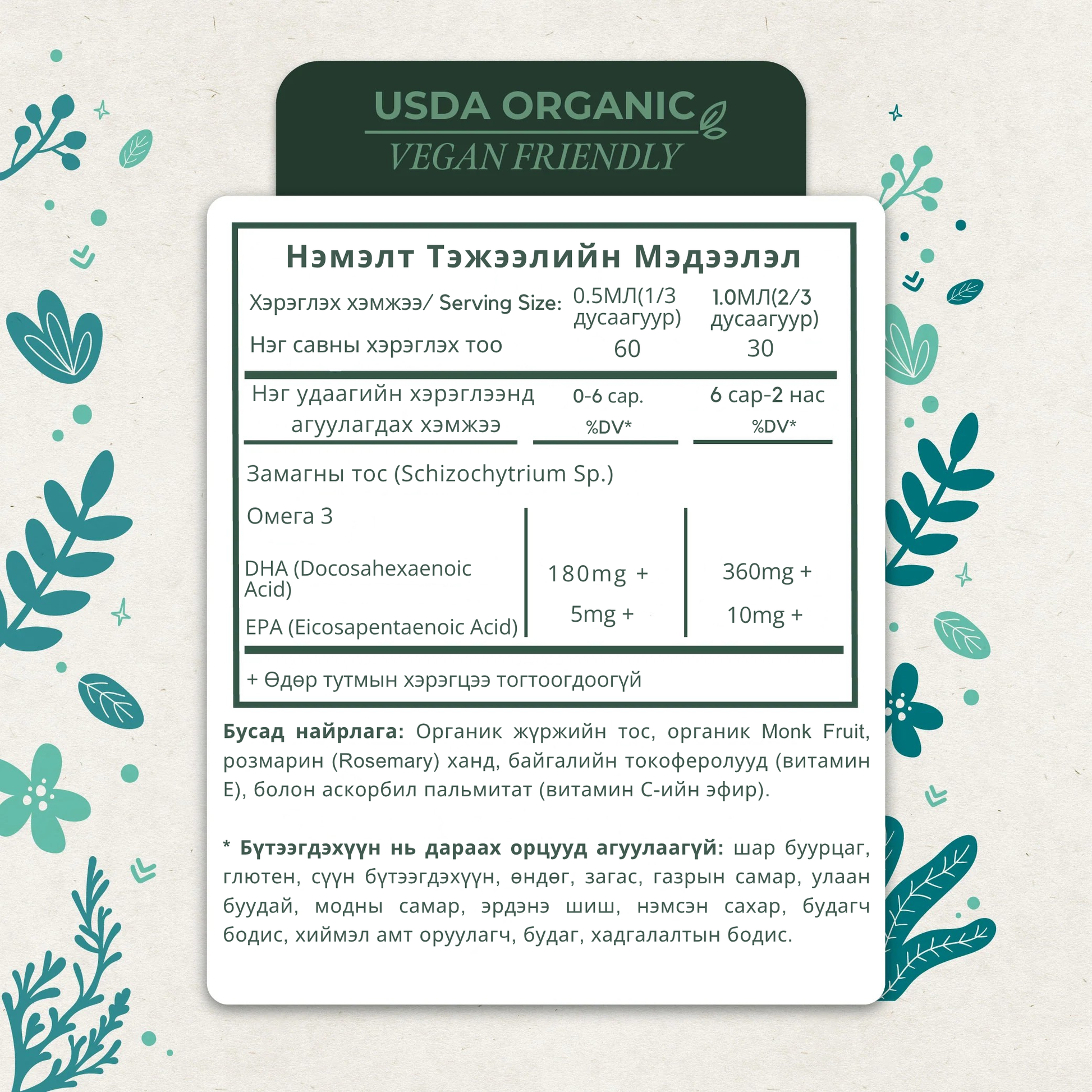 Ургамлын гаралтай DHA буюу Омега3 нь нярай ба бага насны хүүхдэд зориулагдсан.